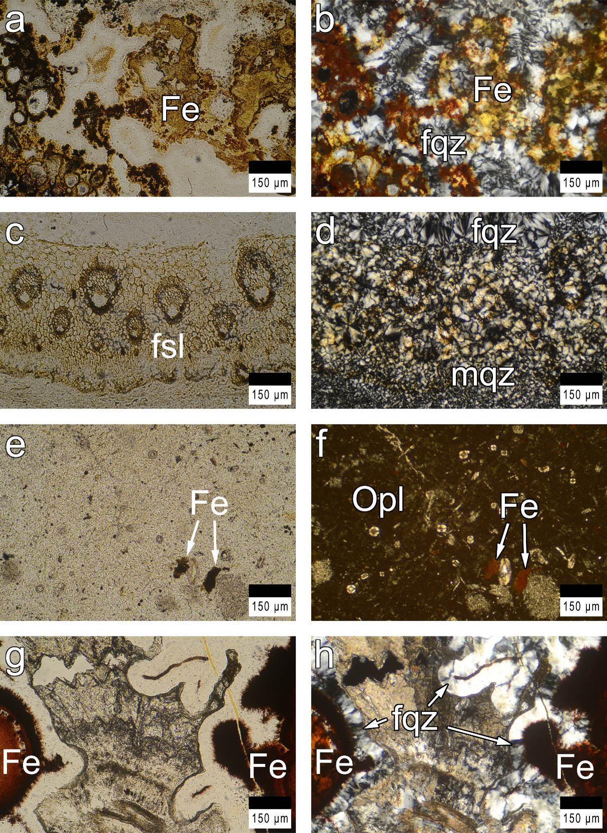 Petrographic thin sections show that the material is composed primarily of quartz but with a high opal content and often Fe-oxihydroxides (Figure 6 a-h) and carbonate. Opal appears as isotropic mass with low refractive index. In some samples, there appears to be more opal than quartz (e.g., Figure 6 e & f). Some samples have irregular bands of fibrous quartz (chalcedony). In some of the thin sections, the plant cell structure is very well preserved (Figure 6 c).