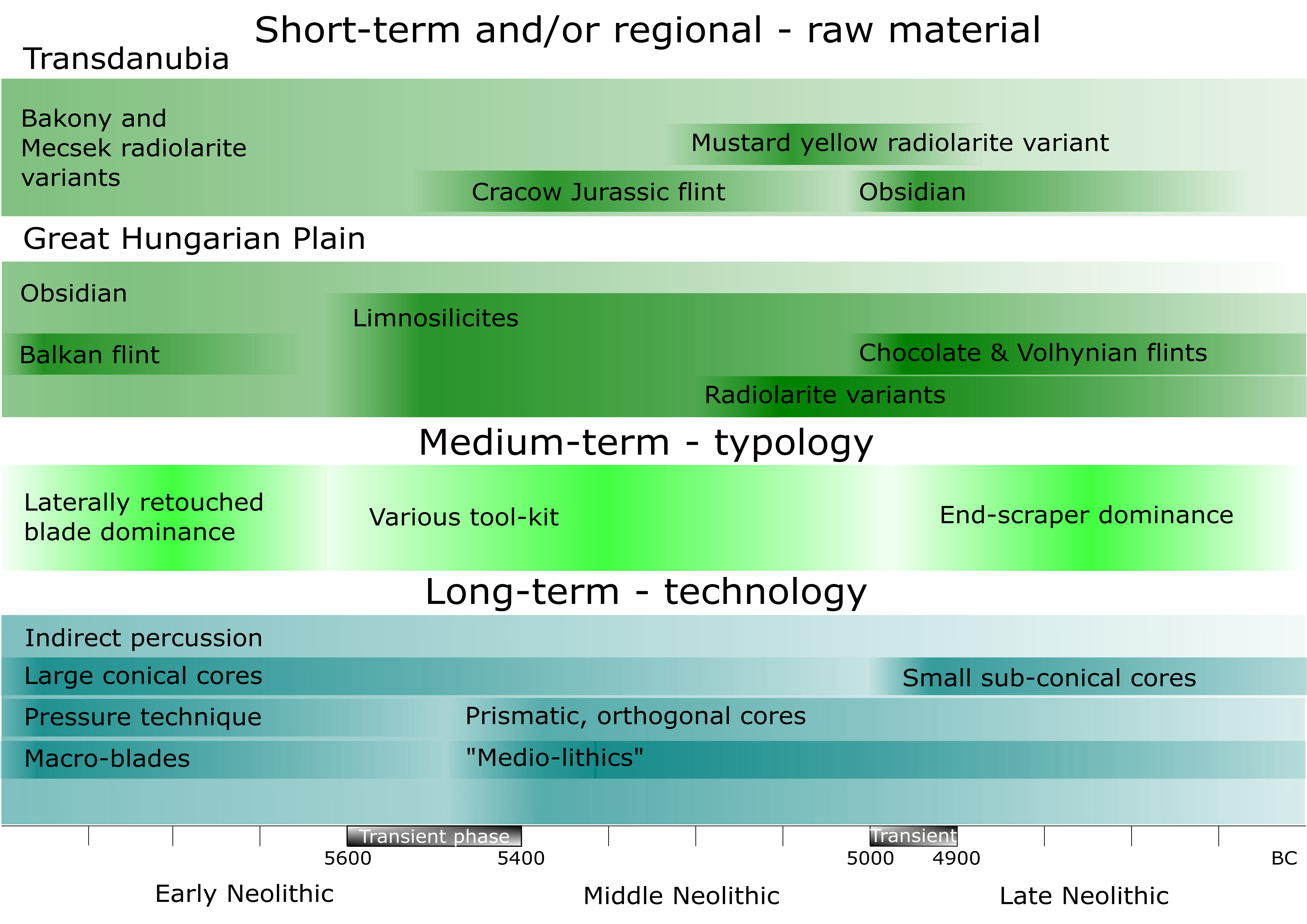 Research into the Neolithic period in Hungary (between 6000 and 4600 or 4500 BCE) began at the turning of the 19th and 20th century, and the cultural frameworks that we use today were coined relatively early. In the last hundred years, Hungarian prehistoric research has done much to delineate these cultures' spatial and temporal boundaries. On this basis, the territory of present-day Hungary can be divided into two major regions - one in the west and one in the east - and three major chronological phases. Although systematic research on Neolithic knapped stone tools in Hungary does not have a long history, the lessons of the last thirty years are sufficient to compare the experience with other elements of material culture and to draw further conclusions by integrating them at a higher level. It is generally agreed that the expedient nature of Neolithic stone tools does not allow for the kind of sophisticated typologies that we know from the Palaeolithic or Mesolithic. However, we are not necessarily lacking general phenomena that could be used to distinguish one region, period, or archaeological culture from another. These phenomena may be differences in the choice of raw materials, differences in typology sets, or technological changes, which are exhaustively discussed with numerous examples from the last decades in this paper. Utilizing Fernand Braudel’s tripartite system, we can reconstruct the processes that influenced the choice of raw material as relatively rapid and frequent changes in both areas, thus reflecting short-term cycles. Typological changes were much less frequent and had an impact in both the eastern and western parts of the region. However, if we look at the broadest period, only one detectable change can be observed, which is in the field of technology, and it occurred at the end of the Early Neolithic. For the rest of the Neolithic, we almost exclusively encounter debitage products and tools derived from indirect percussion applied to regional raw materials, largely using a prismatic or orthogonal core strategy.