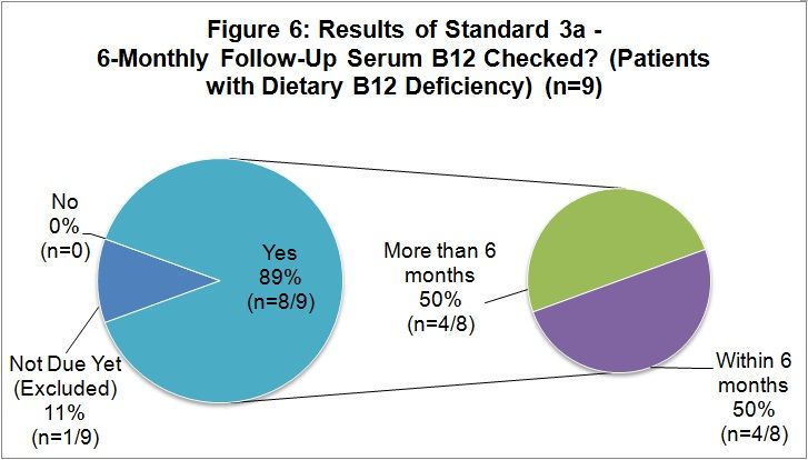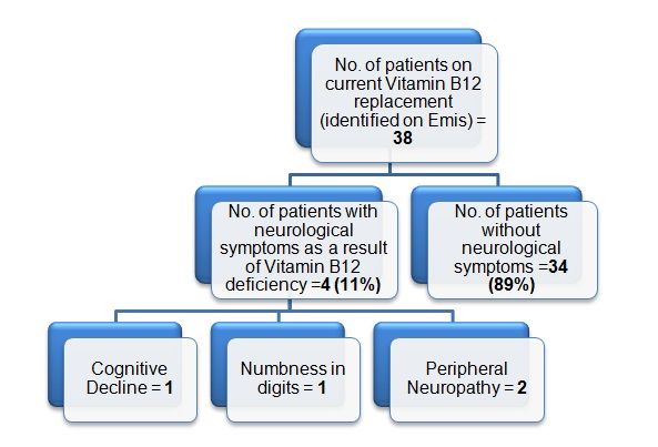 Discussion: There is a need to improve the investigation for B12 deficiency, adherence to clinical guidelines, and documentation of patients’ diagnoses, treatment plans, dietary statuses, and required monitoring. We anticipate that adhering to guidelines when appropriate, with clear documentation, will improve the diagnosis and management of vitamin B12 deficiency so that safe prescribing and potential cost savings can be achieved.