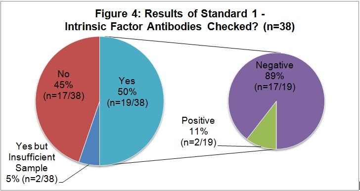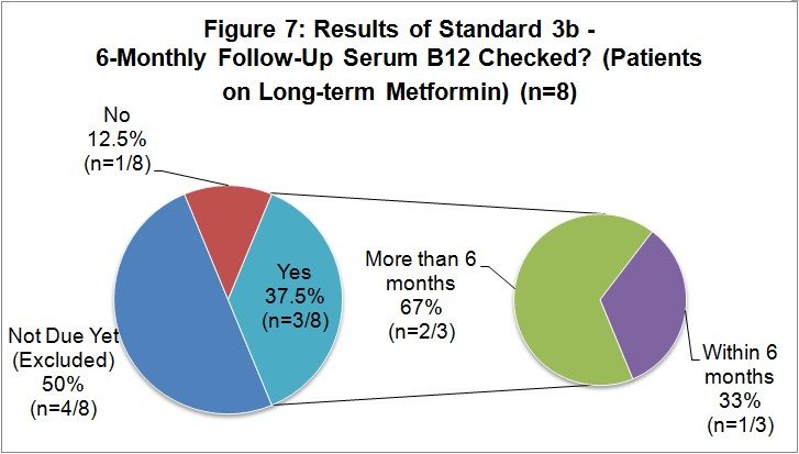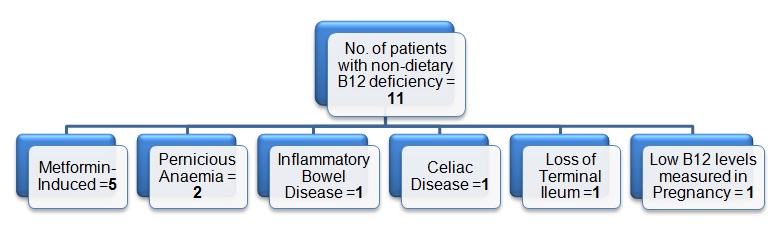 Results: Thirty-eight patients (66% females, 34% males) receiving treatment for B12 deficiency were identified. Of these, 55% (21/38) had intrinsic factor antibodies checked and 52% (13/25) were managed according to the guidelines. 100% (8/8) of patients with dietary B12 deficiency (non-vegans) and 75% (3/4) of B12-deficient patients on long-term metformin have had follow-up serum B12 monitoring.